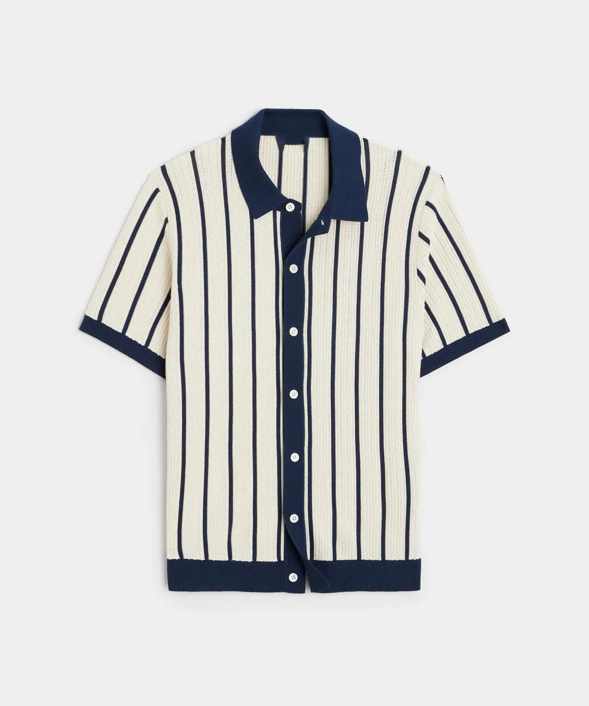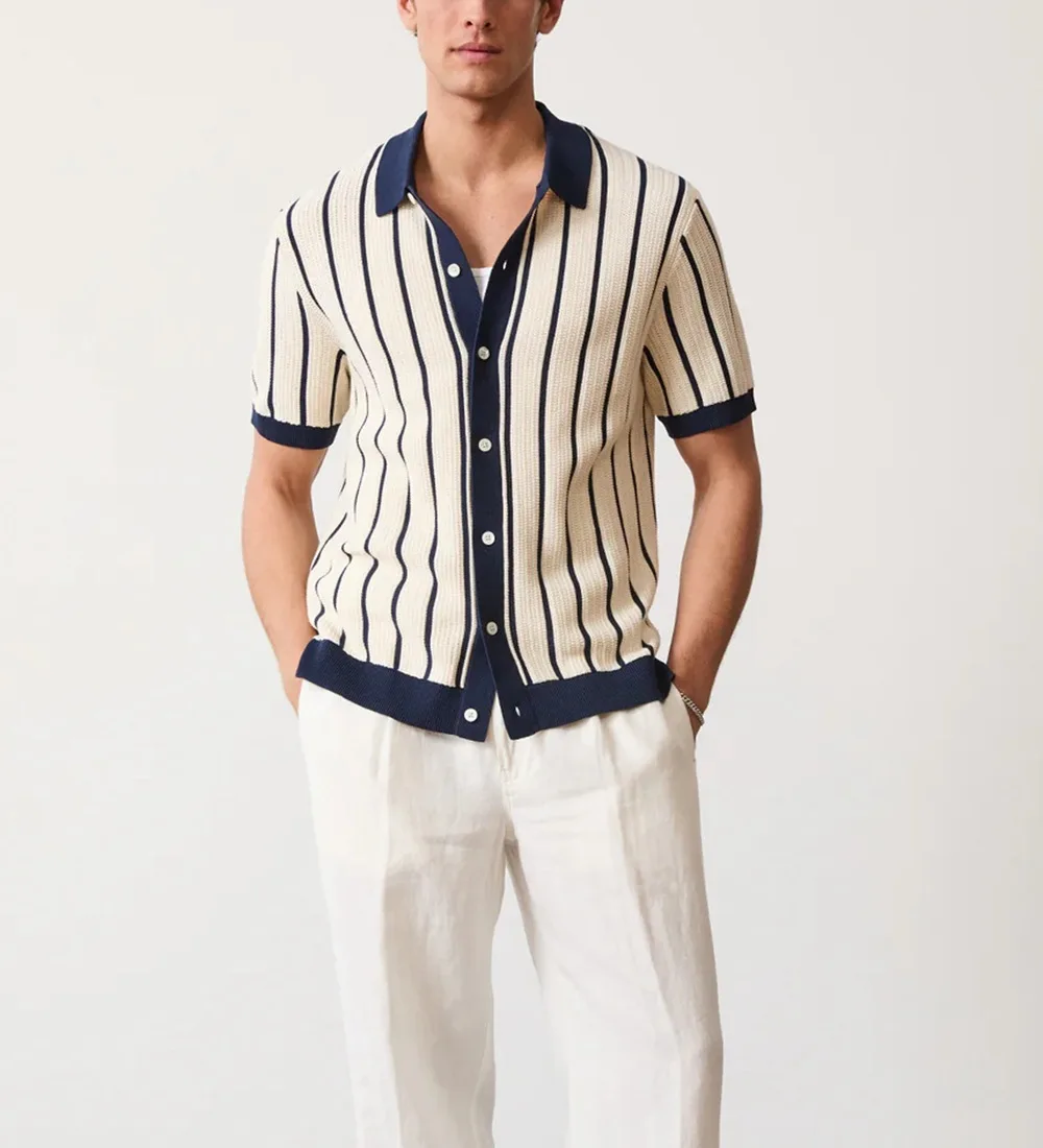 Sua gola polo aberta em estilo resort/cubana cria um visual sofisticado e moderno, enquanto a modelagem Slim Fit / Regular Ajustado garante caimento preciso, valorizando o corpo sem restringir os movimentos. O design listrado vertical adiciona um toque clássico europeu, alongando a silhueta e elevando o visual casual.