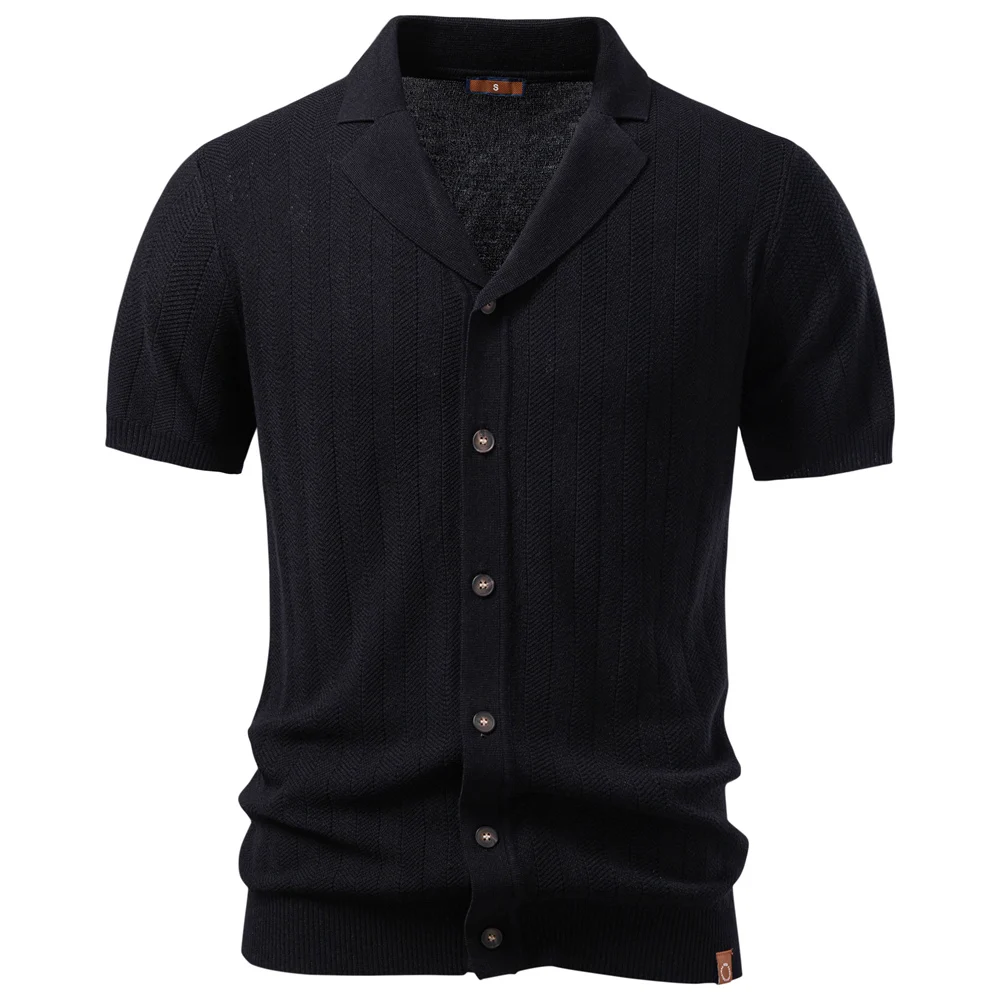 Confeccionada em tricô texturizado de poliéster com viscose, a peça possui toque macio, excelente respirabilidade e ótimo caimento no corpo. A modelagem moderna e ajustada valoriza a silhueta masculina, enquanto os botões frontais permitem versatilidade no uso.
