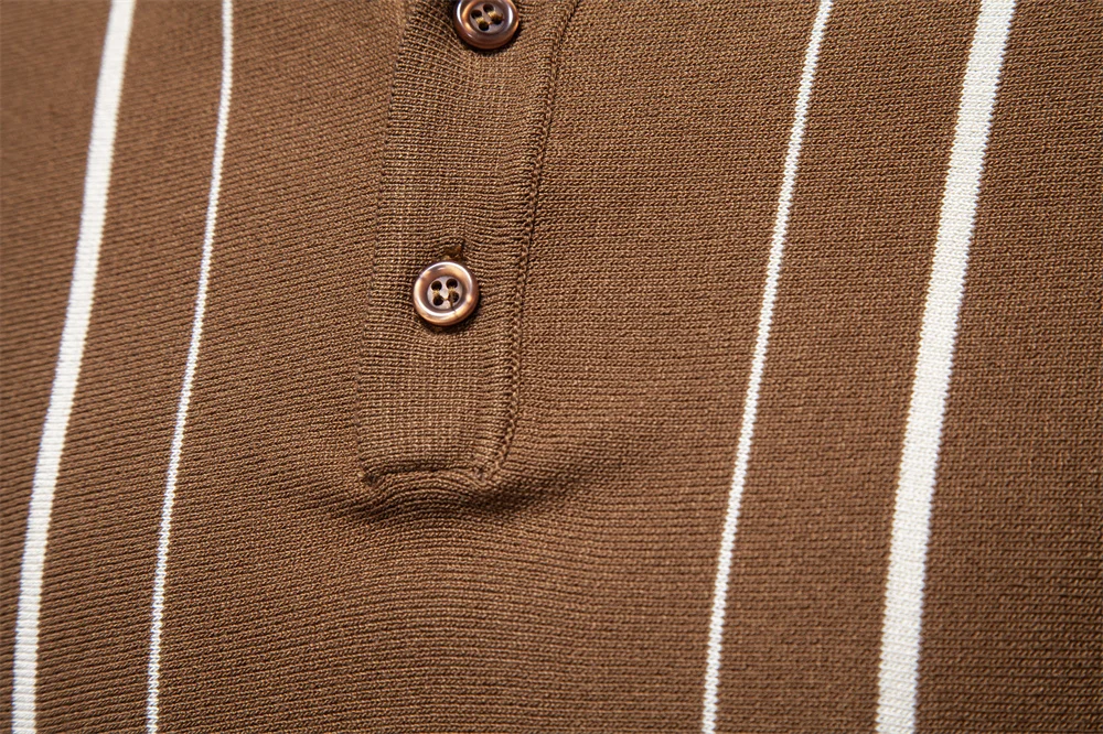 O design apresenta listras verticais elegantes, que criam um efeito visual refinado e ajudam a alongar a silhueta. A gola polo clássica com três botões frontais adiciona um toque tradicional e versátil, permitindo diferentes estilos de uso — mais casual com os botões abertos ou mais elegante quando fechados.