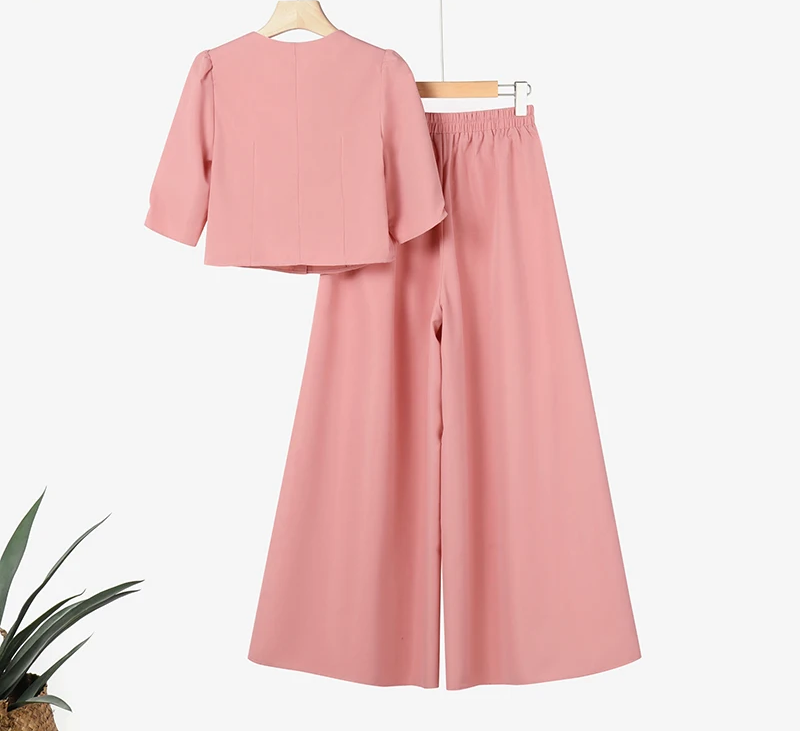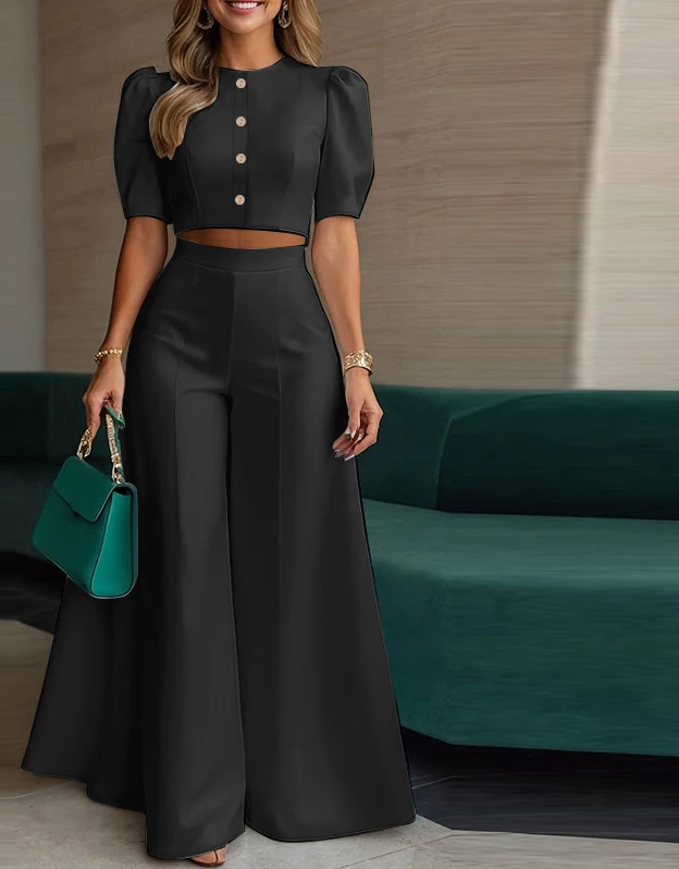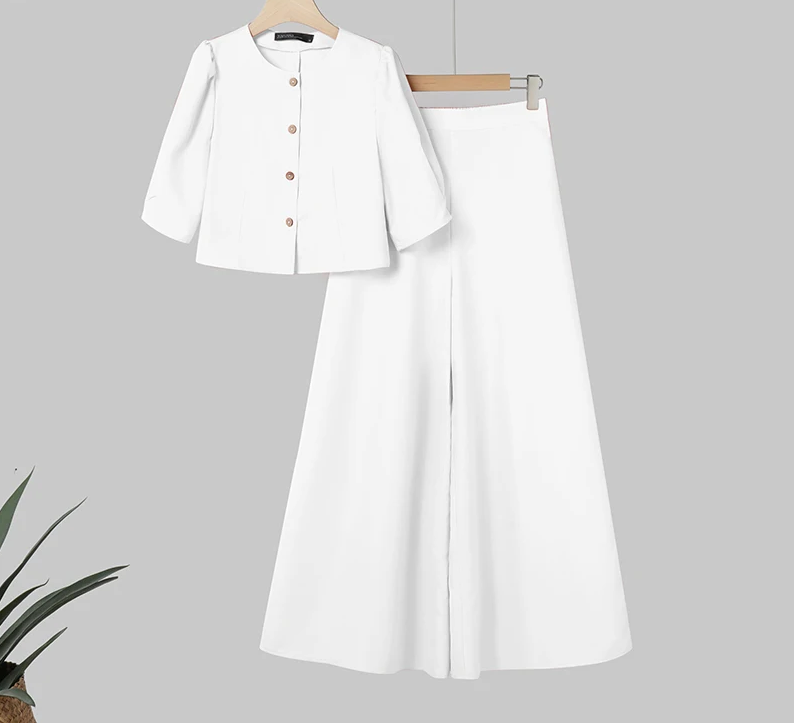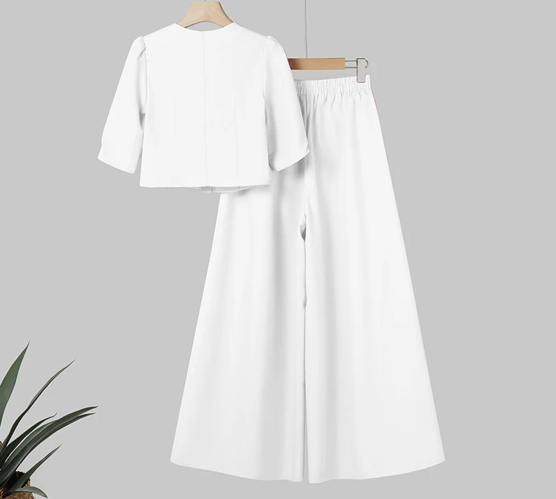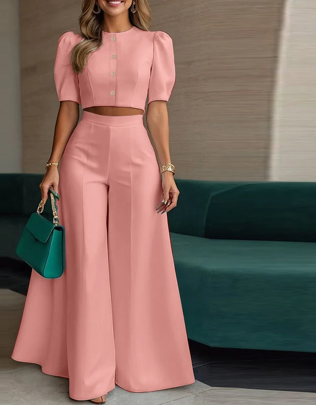 Calça: Cintura alta, corte reto/amplo com excelente fluidez