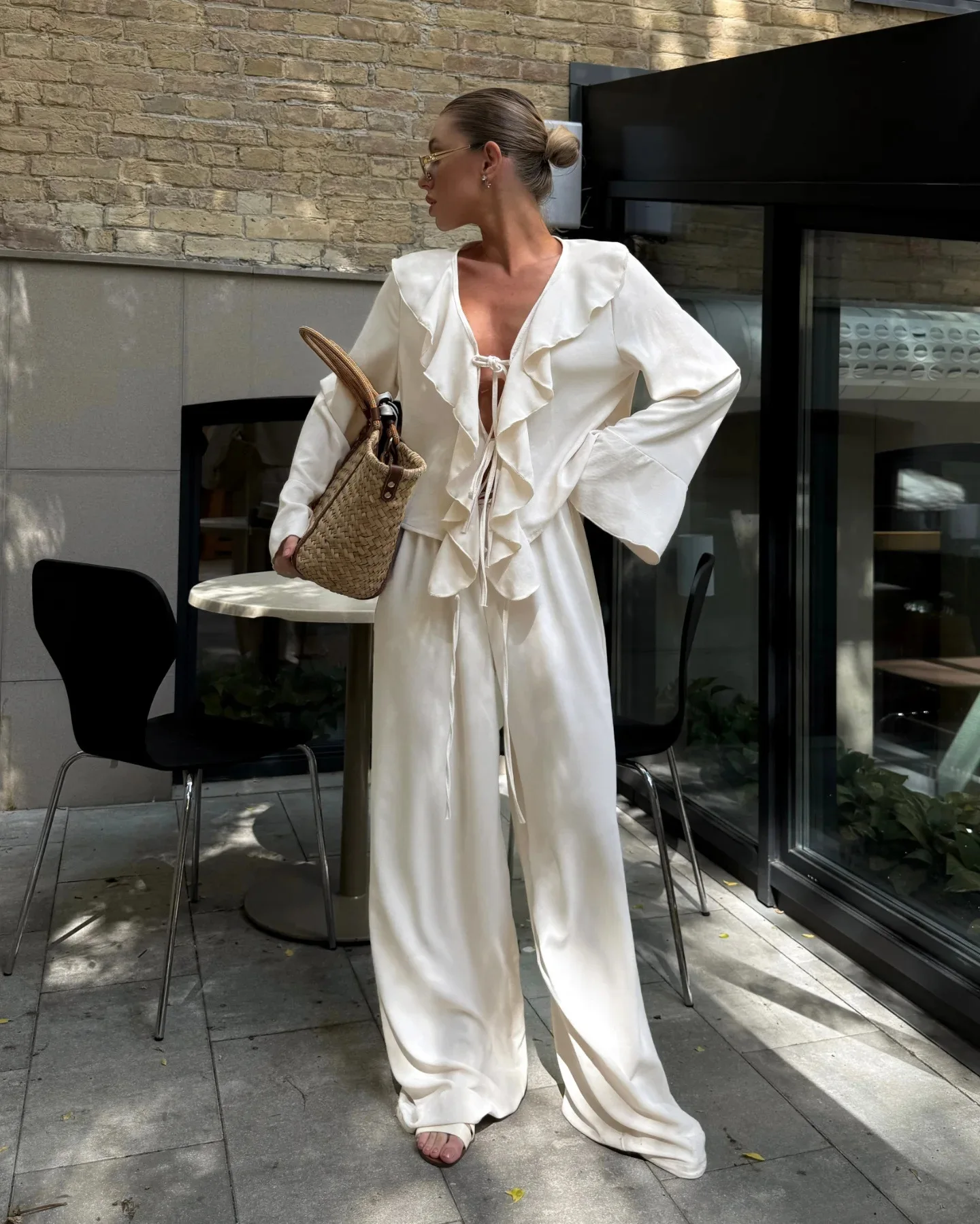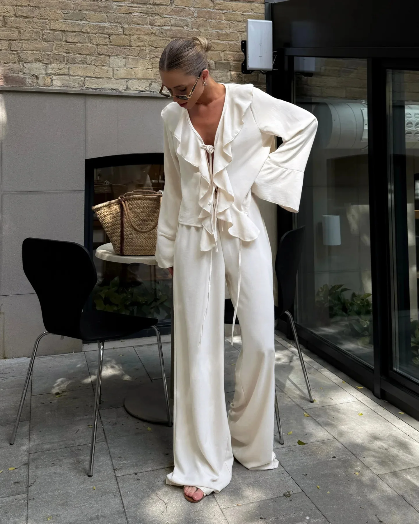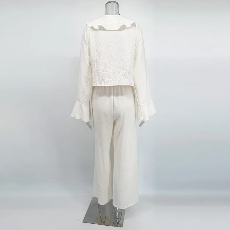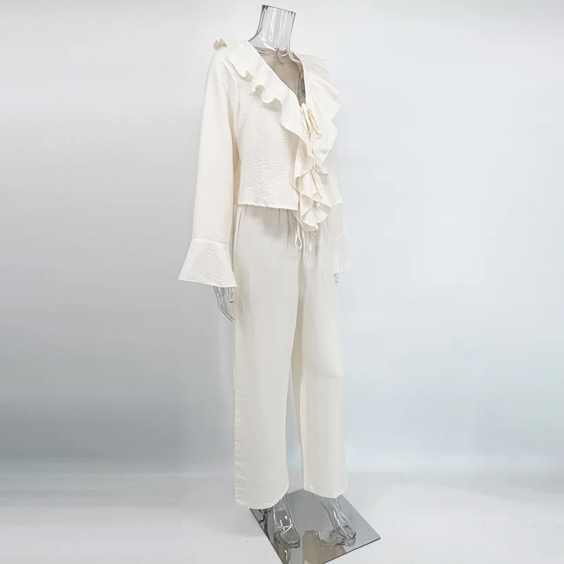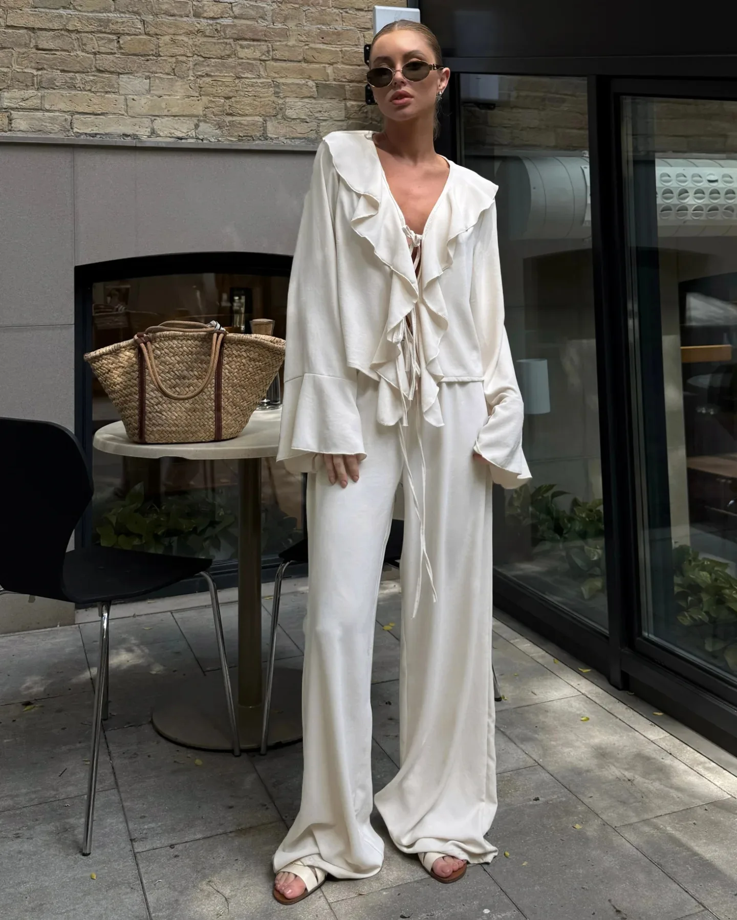 Composto por uma blusa com babados delicados e uma calça pantalona de caimento amplo, o conjunto cria uma silhueta leve, moderna e naturalmente elegante. A blusa adiciona movimento e charme ao visual, enquanto a pantalona alonga a silhueta e garante sofisticação sem esforço.