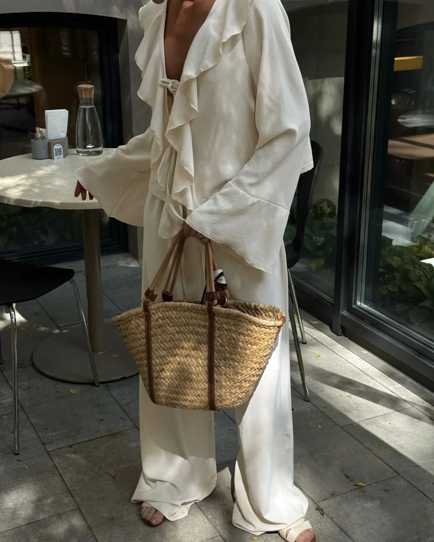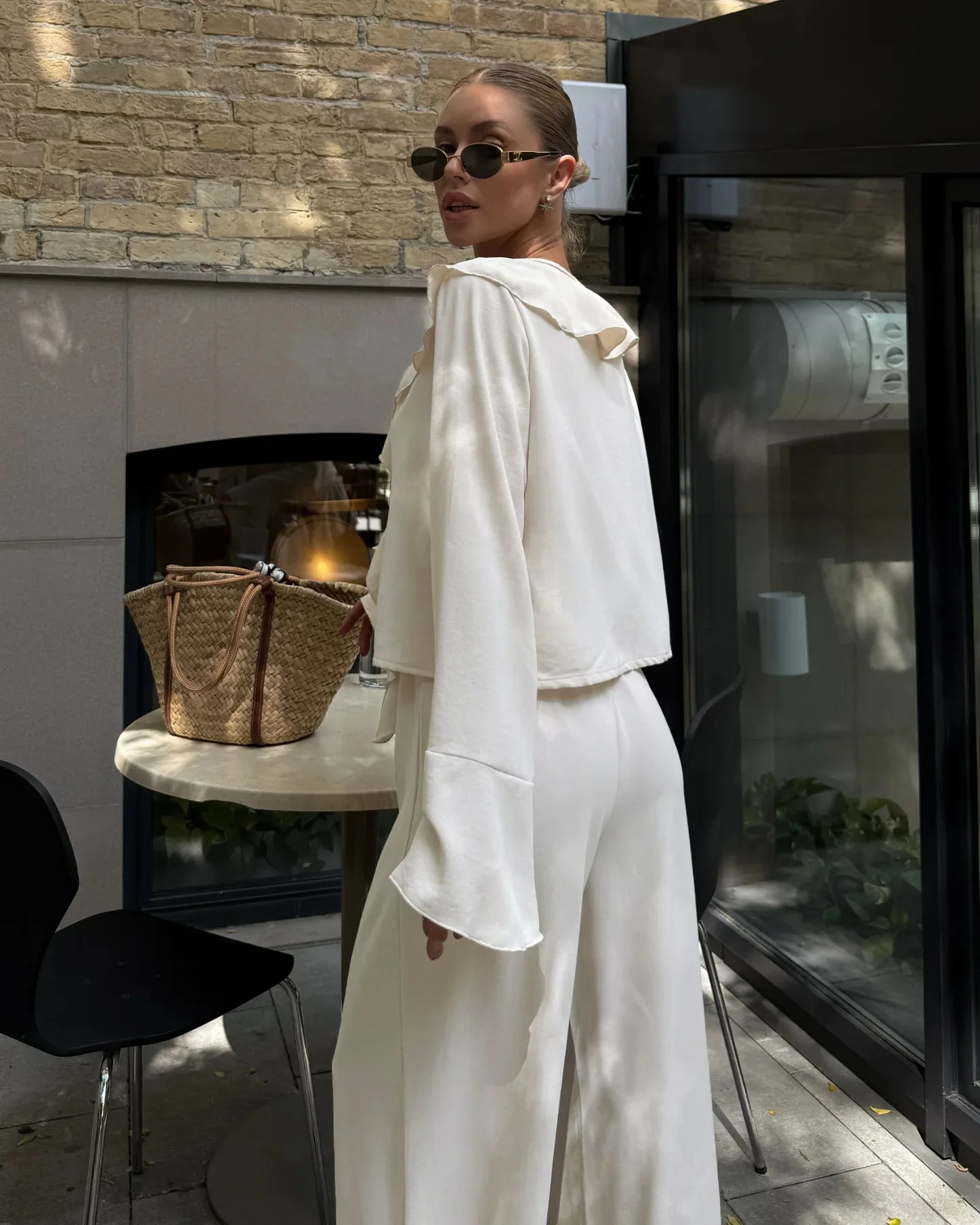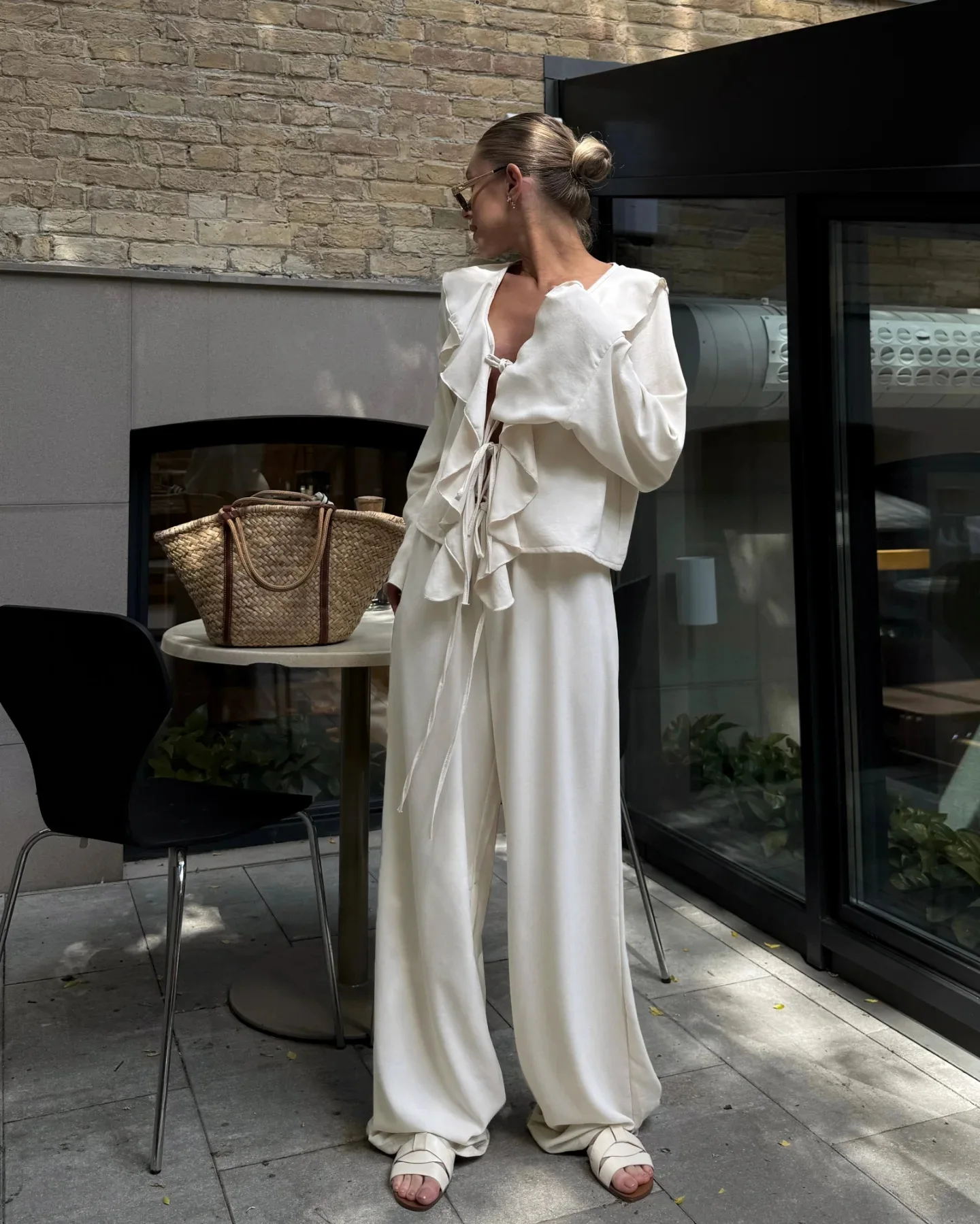Composto por uma blusa com babados delicados e uma calça pantalona de caimento amplo, o conjunto cria uma silhueta leve, moderna e naturalmente elegante. A blusa adiciona movimento e charme ao visual, enquanto a pantalona alonga a silhueta e garante sofisticação sem esforço.