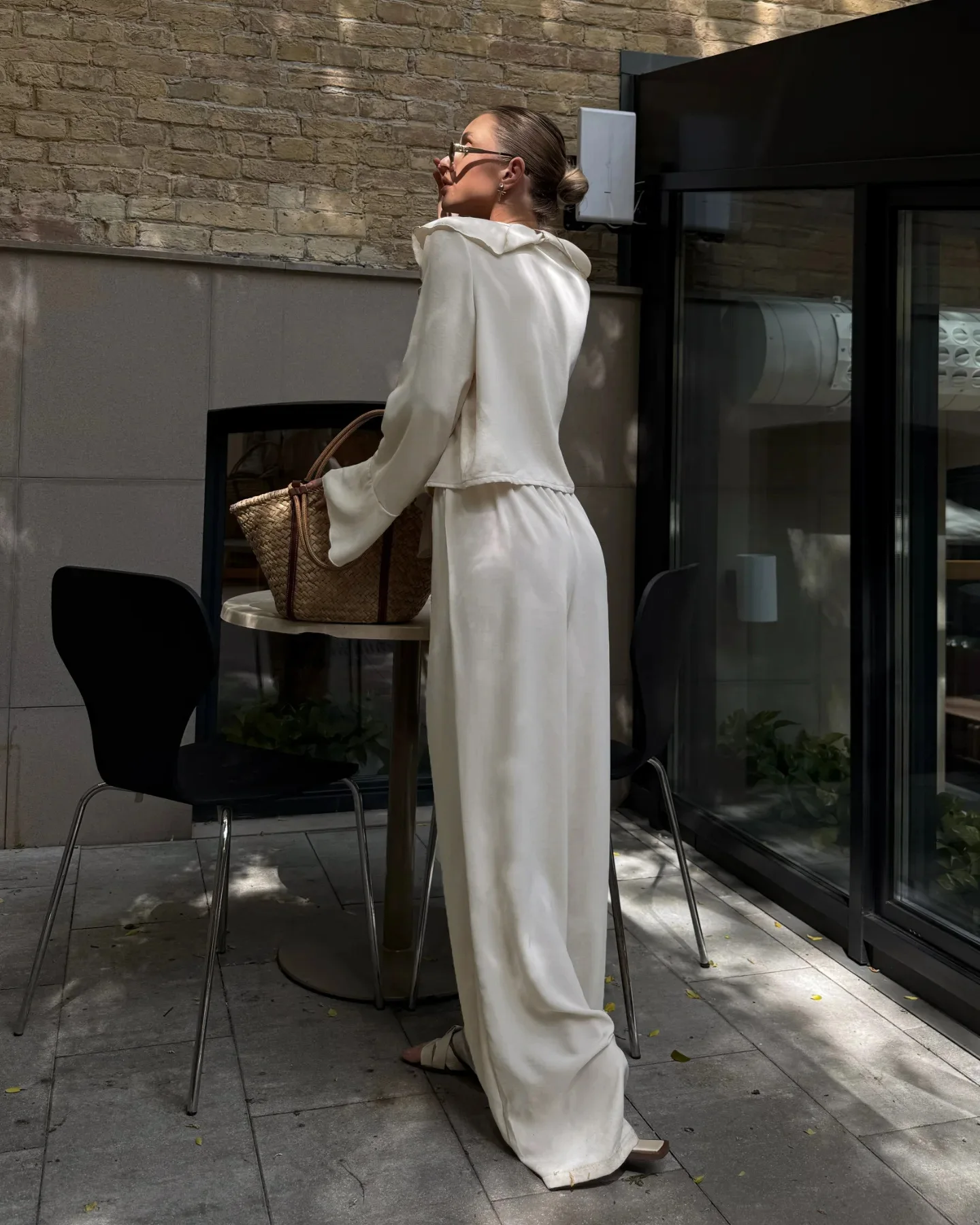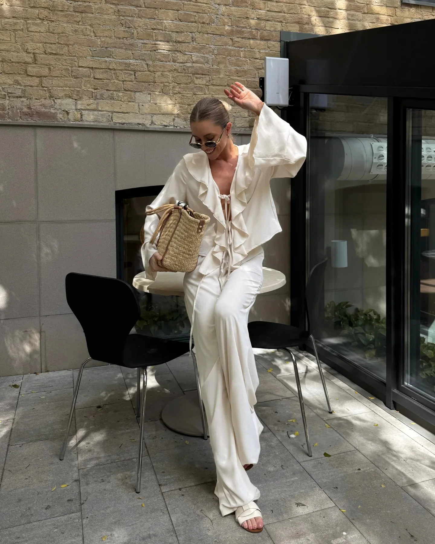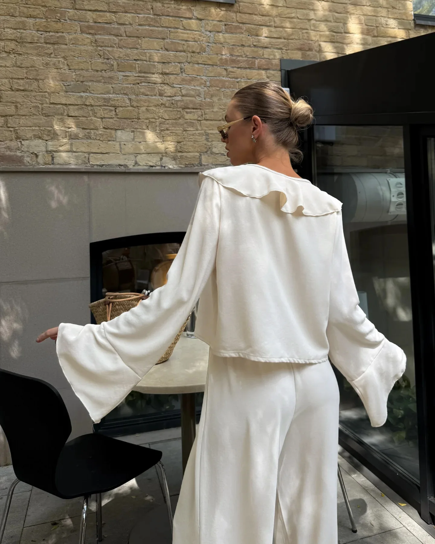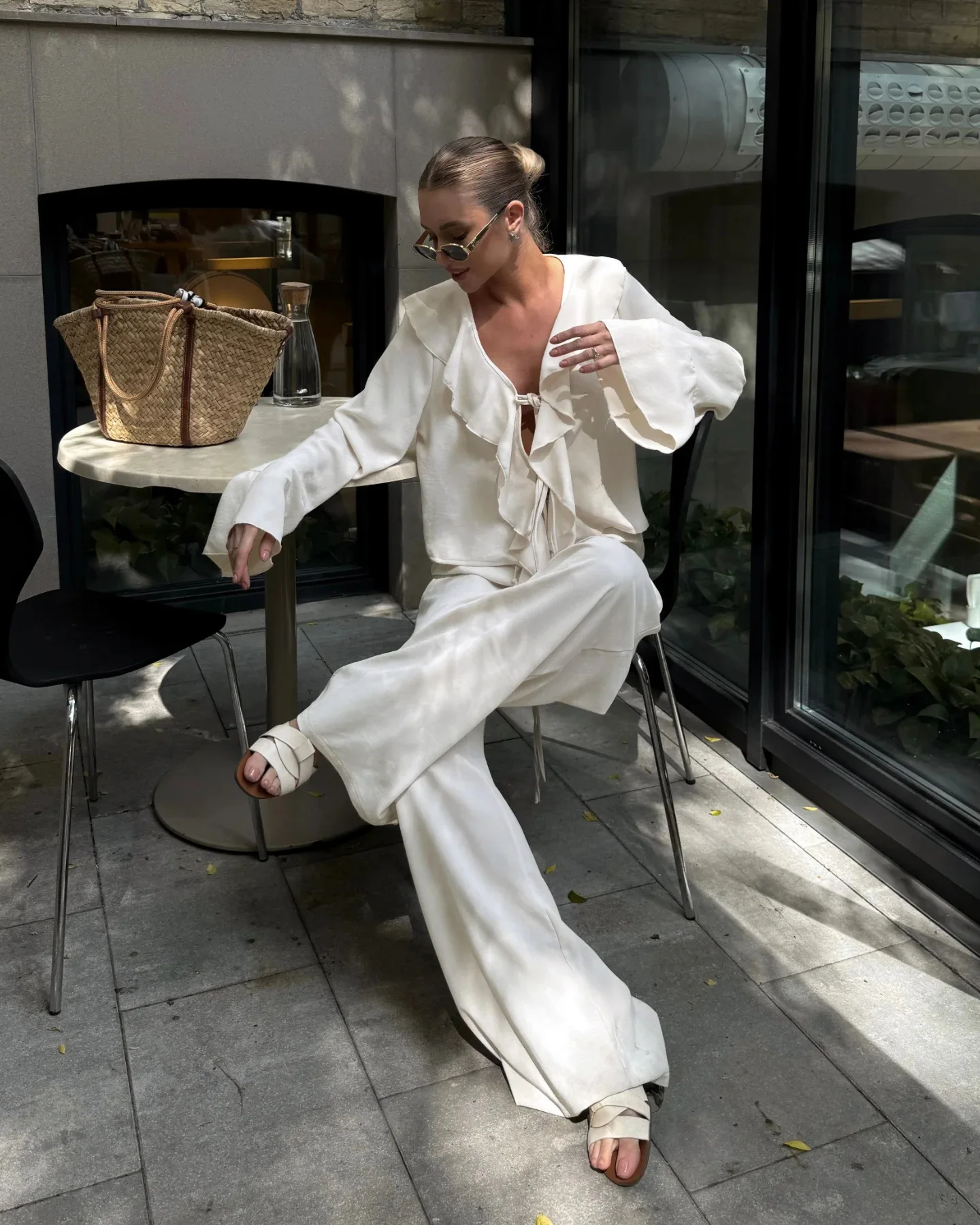 Composto por uma blusa com babados delicados e uma calça pantalona de caimento amplo, o conjunto cria uma silhueta leve, moderna e naturalmente elegante. A blusa adiciona movimento e charme ao visual, enquanto a pantalona alonga a silhueta e garante sofisticação sem esforço.