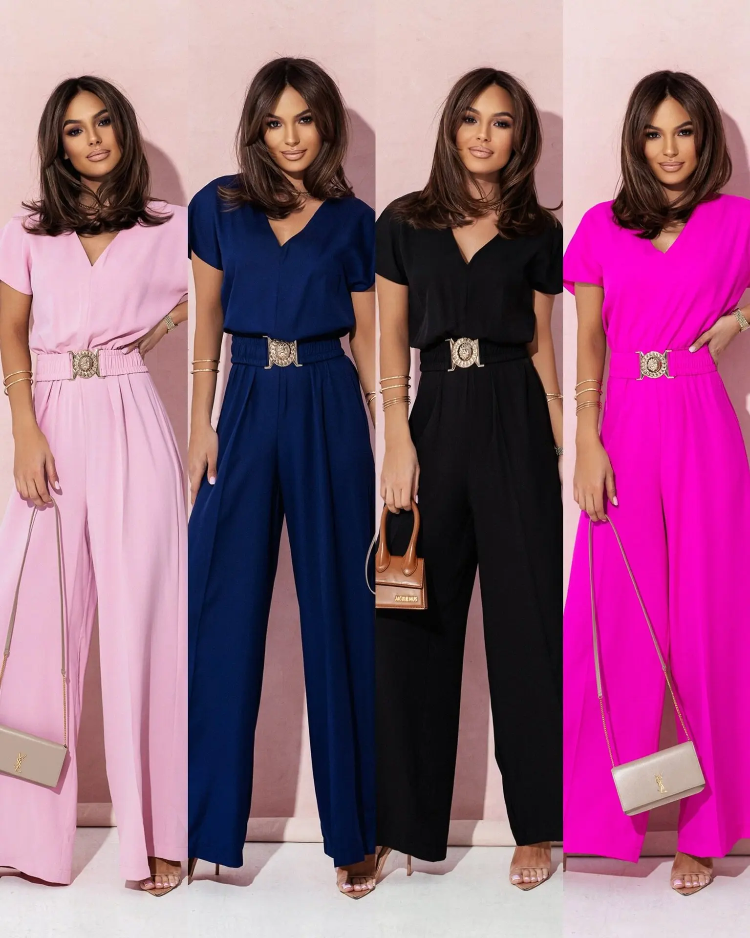 A modelagem pantalona cria um visual alongado e imponente, enquanto o decote em V valoriza o colo com discrição e feminilidade. As mangas curtas equilibram conforto e elegância, e o cinto com fivela metálica marca a cintura com charme clássico. Confeccionado em crepe premium de alfaiataria com viscose acetinada, o tecido garante caimento impecável, toque macio e aparência luxuosa.