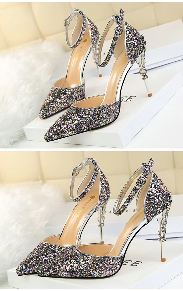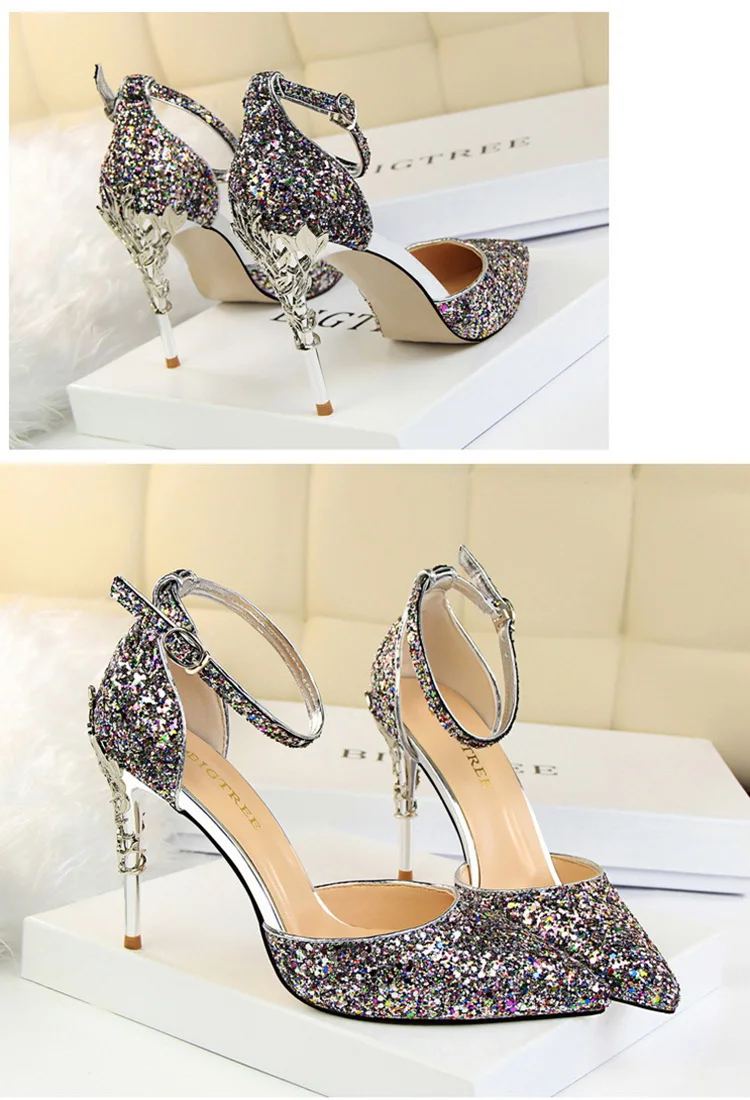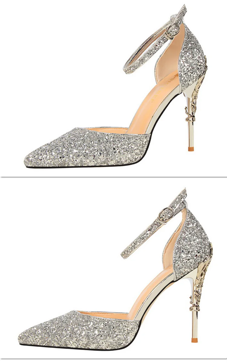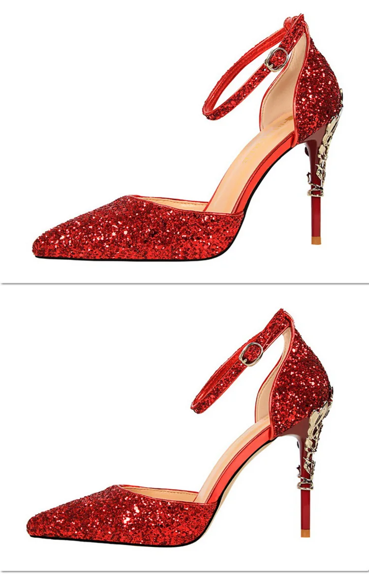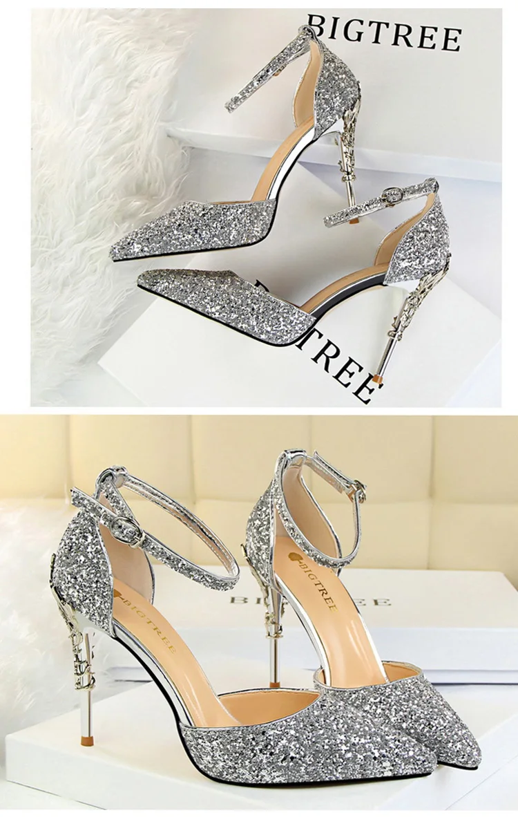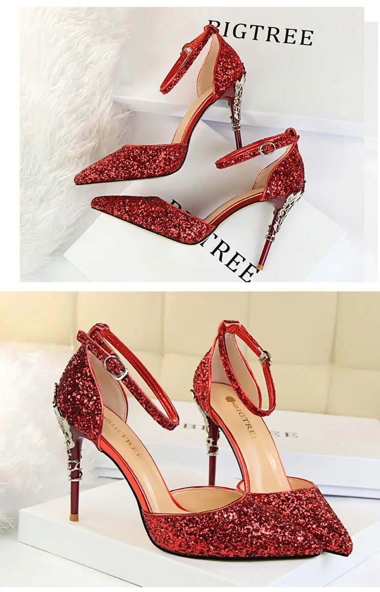 O Salto Glitter Pointed Toe Ankle Strap Stiletto Pumps Bigtree é a escolha perfeita para mulheres que querem se destacar com glamour e sofisticação. Com acabamento em glitter intenso e design marcante, esse modelo combina luxo moderno com um toque ousado da moda chinesa contemporânea.