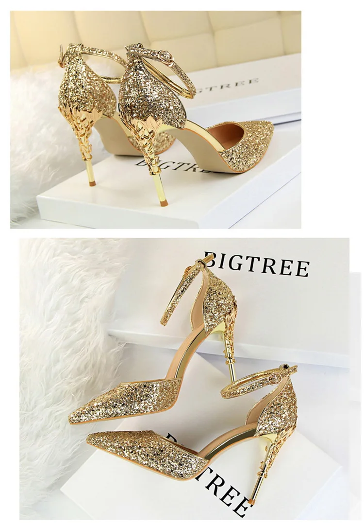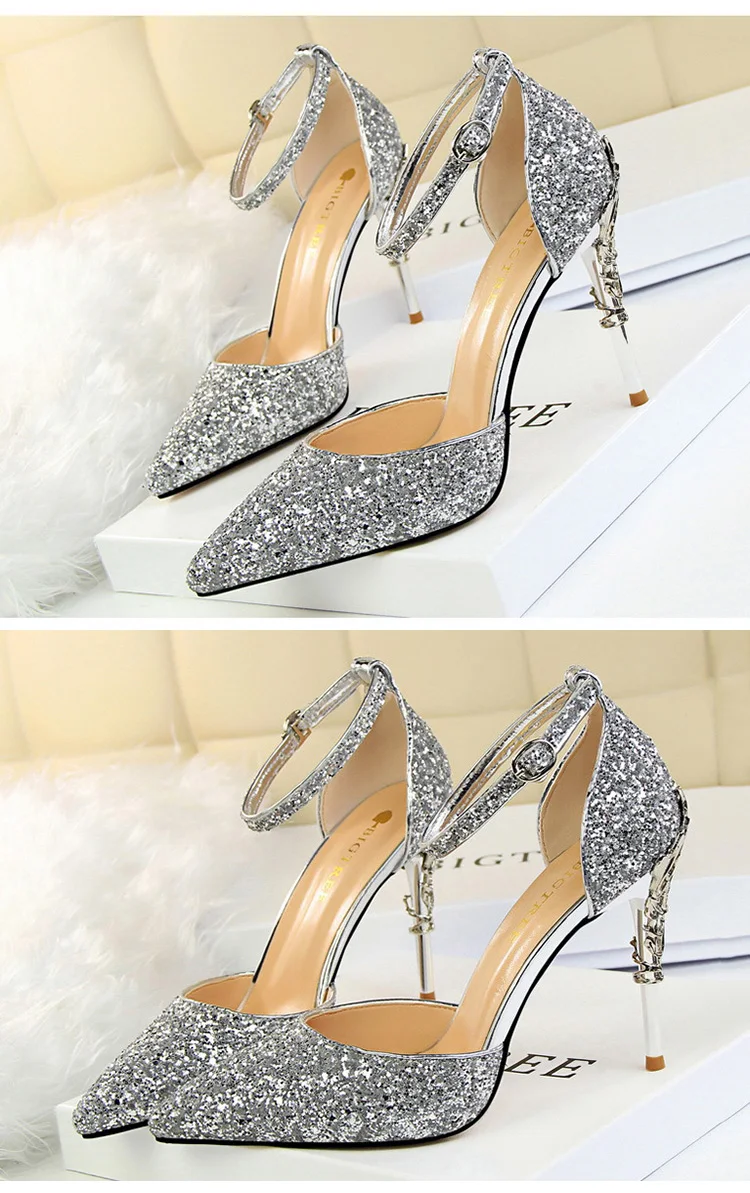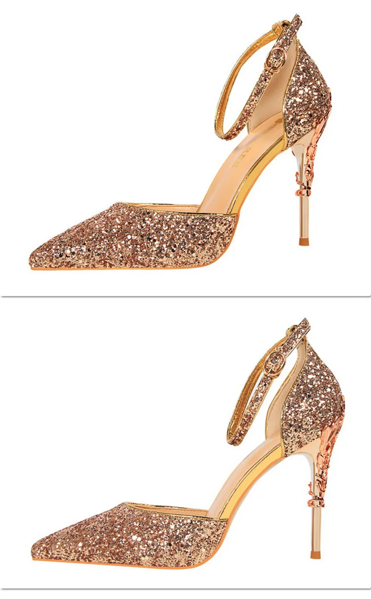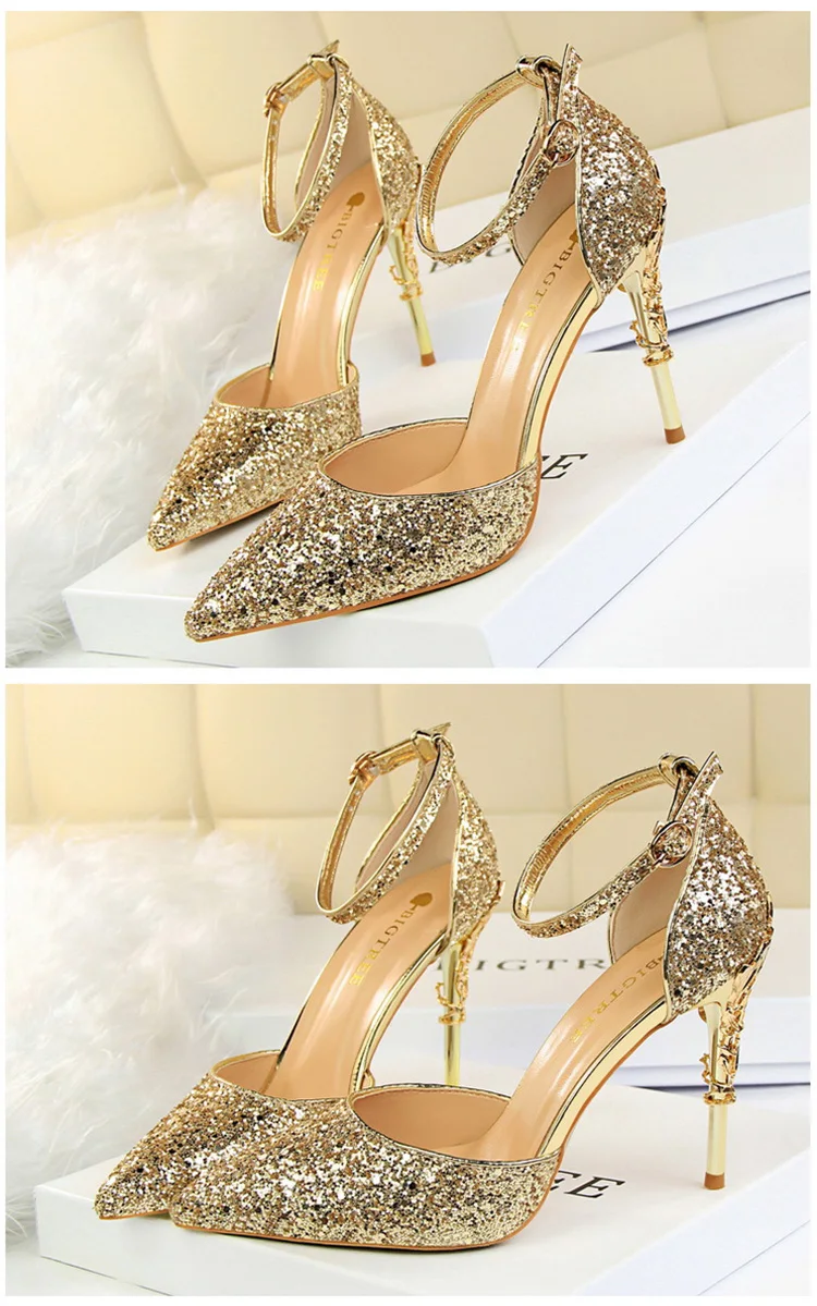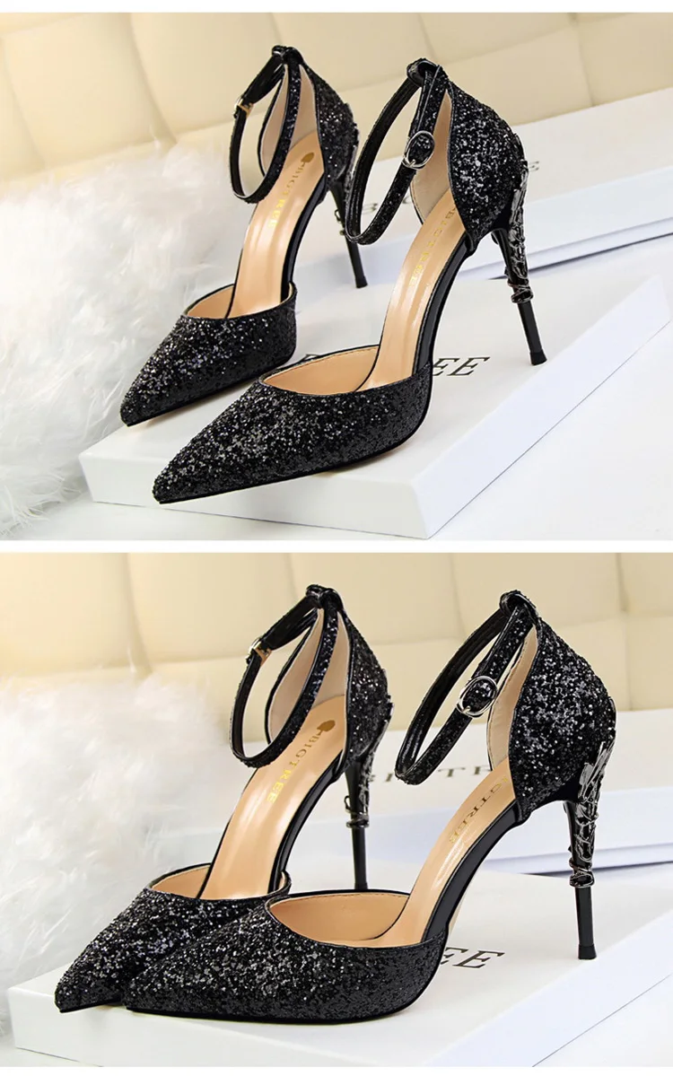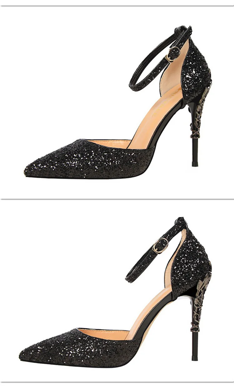 O Salto Glitter Pointed Toe Ankle Strap Stiletto Pumps Bigtree é a escolha perfeita para mulheres que querem se destacar com glamour e sofisticação. Com acabamento em glitter intenso e design marcante, esse modelo combina luxo moderno com um toque ousado da moda chinesa contemporânea.