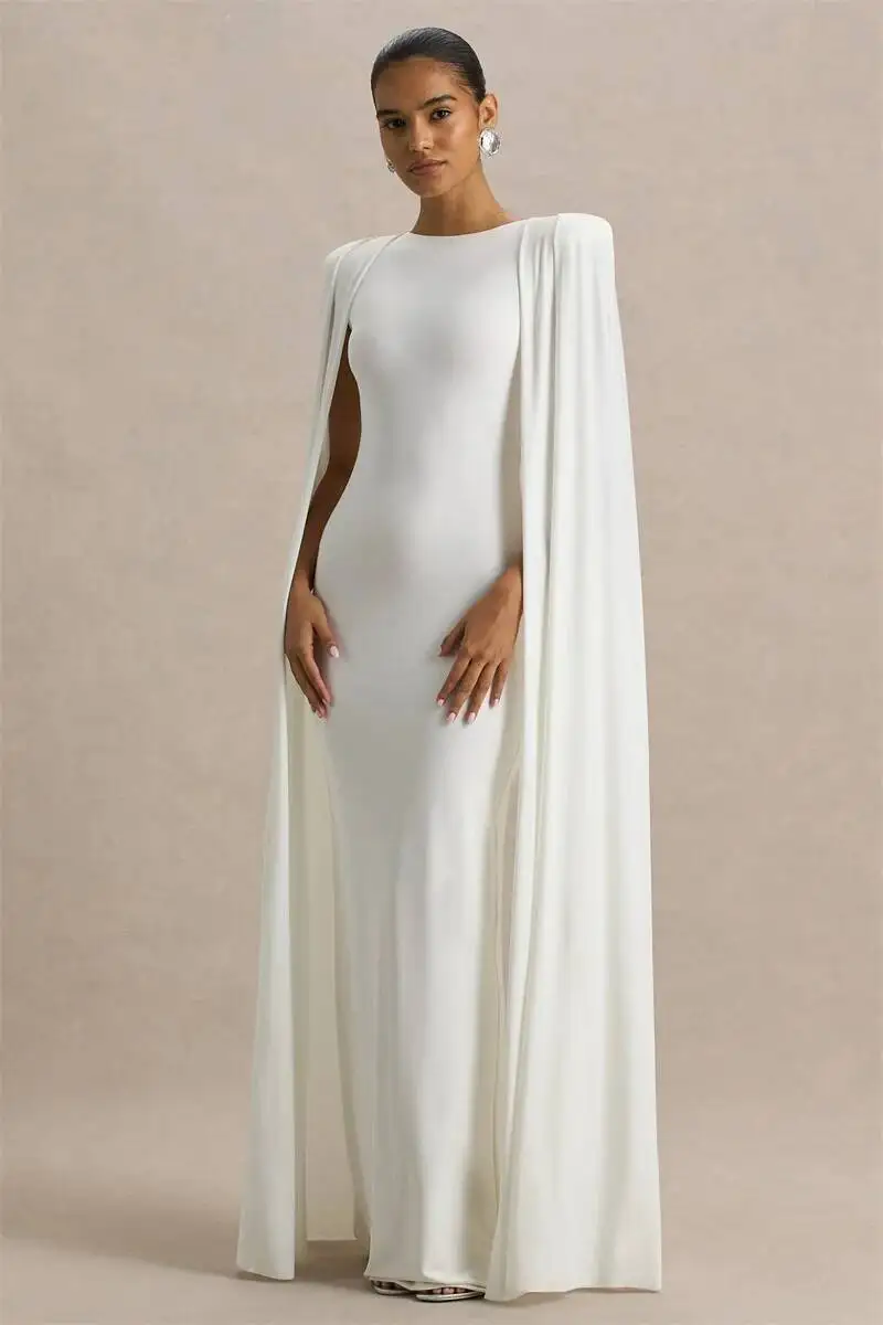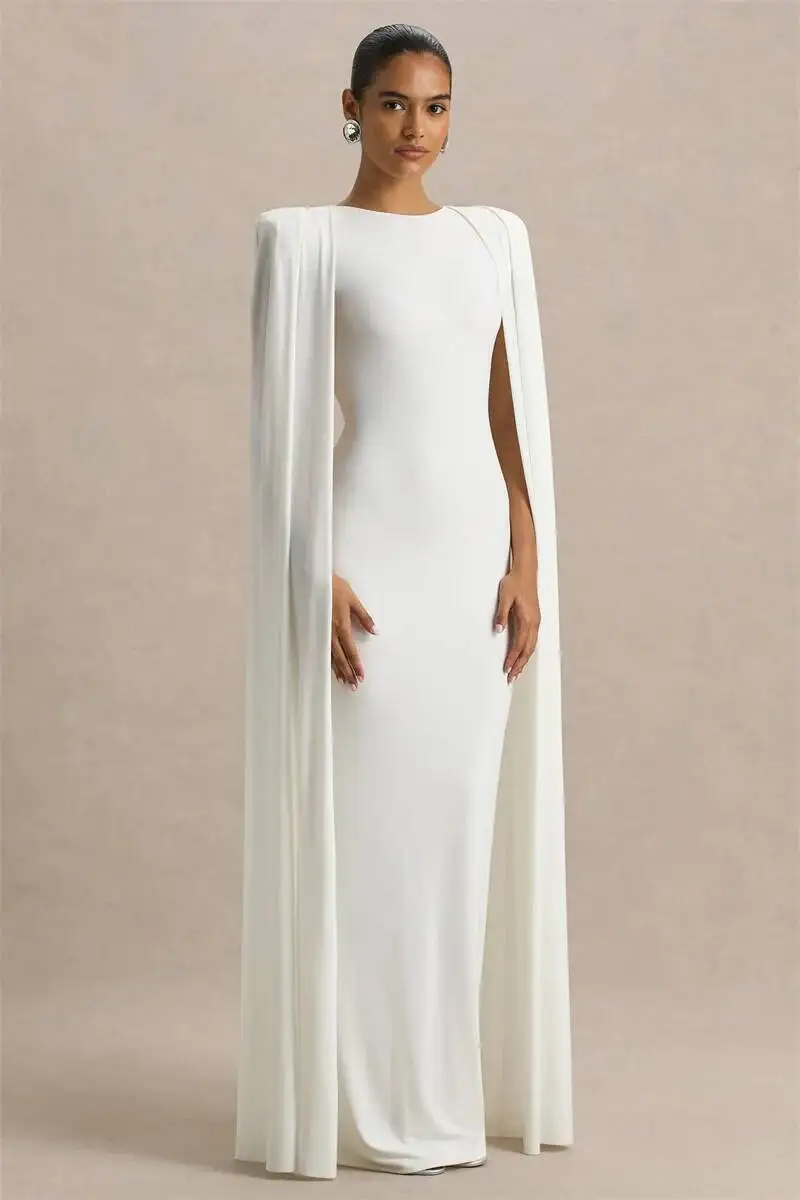 Elegância máxima: A combinação de branco puro com capa dividida cria um visual digno de tapete vermelho.