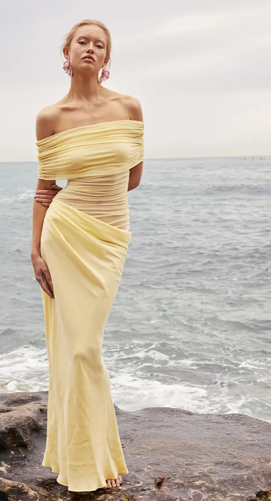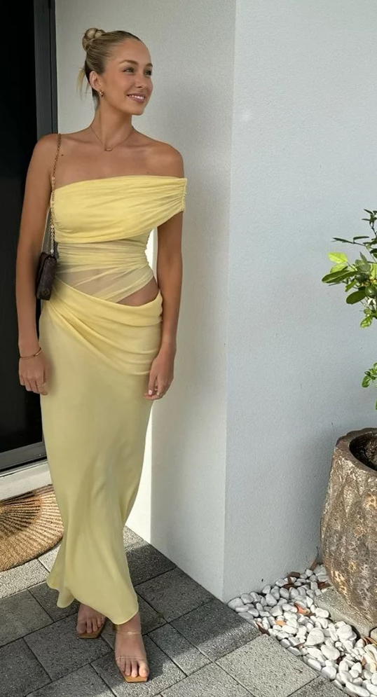 Com um design fluido e levemente estruturado, ele valoriza a silhueta de forma natural, oferecendo conforto sem abrir mão da elegância. Seu tecido leve proporciona movimento gracioso a cada passo, enquanto a cor citrina transmite energia e luminosidade, sendo ideal para eventos sociais, coquetéis, jantares e ocasiões especiais.