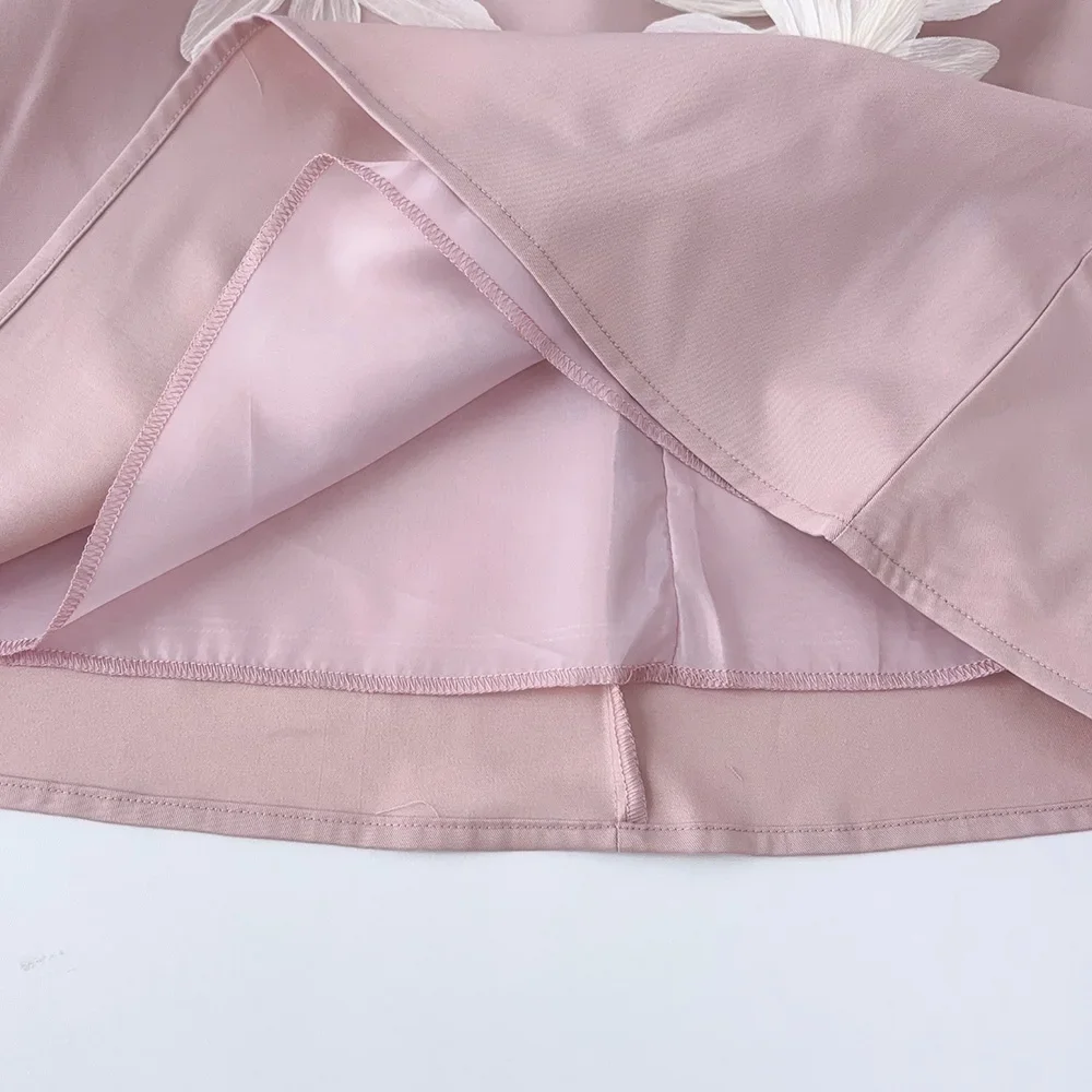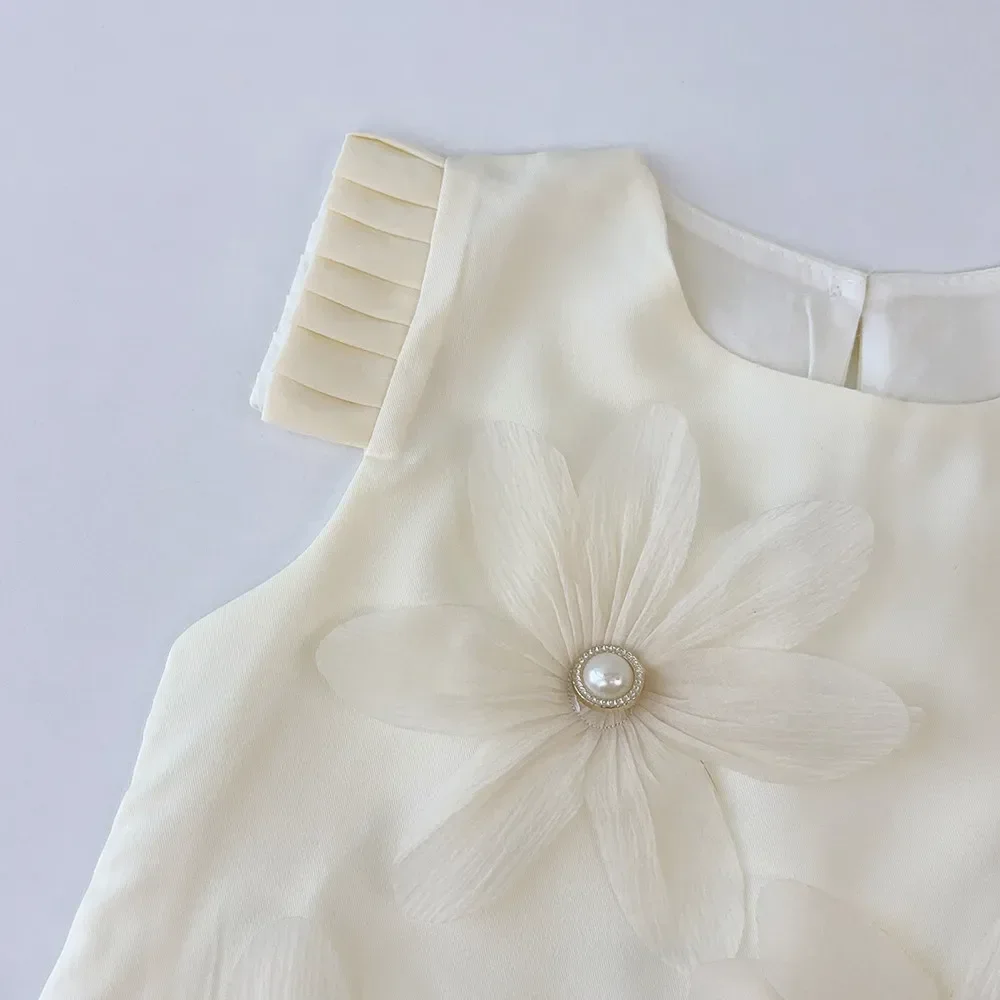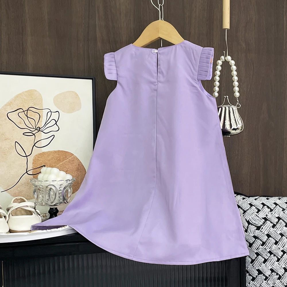 O vestido apresenta um corpo estruturado com acabamento delicado, saia rodada com leve volume e detalhes florais com pérolas que conferem um toque clássico e elegante. A parte superior possui fechamento prático nas costas com zíper invisível ou botão, garantindo facilidade ao vestir. A saia possui forro em tecido macio, que garante conforto durante todo o uso, permitindo liberdade para brincar e dançar.
