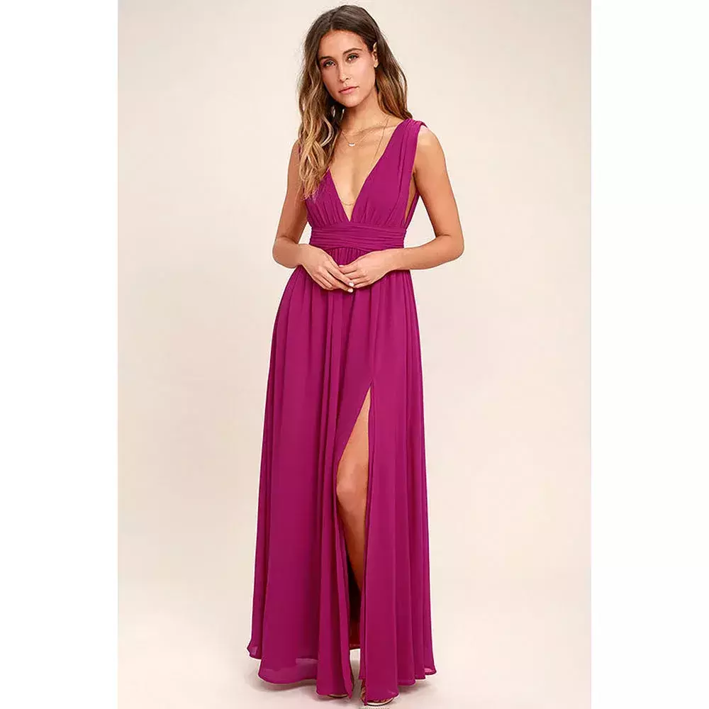 Com corte maxi e modelagem slim, o vestido alonga a silhueta e garante um visual imponente, perfeito para quem deseja ser o centro das atenções.