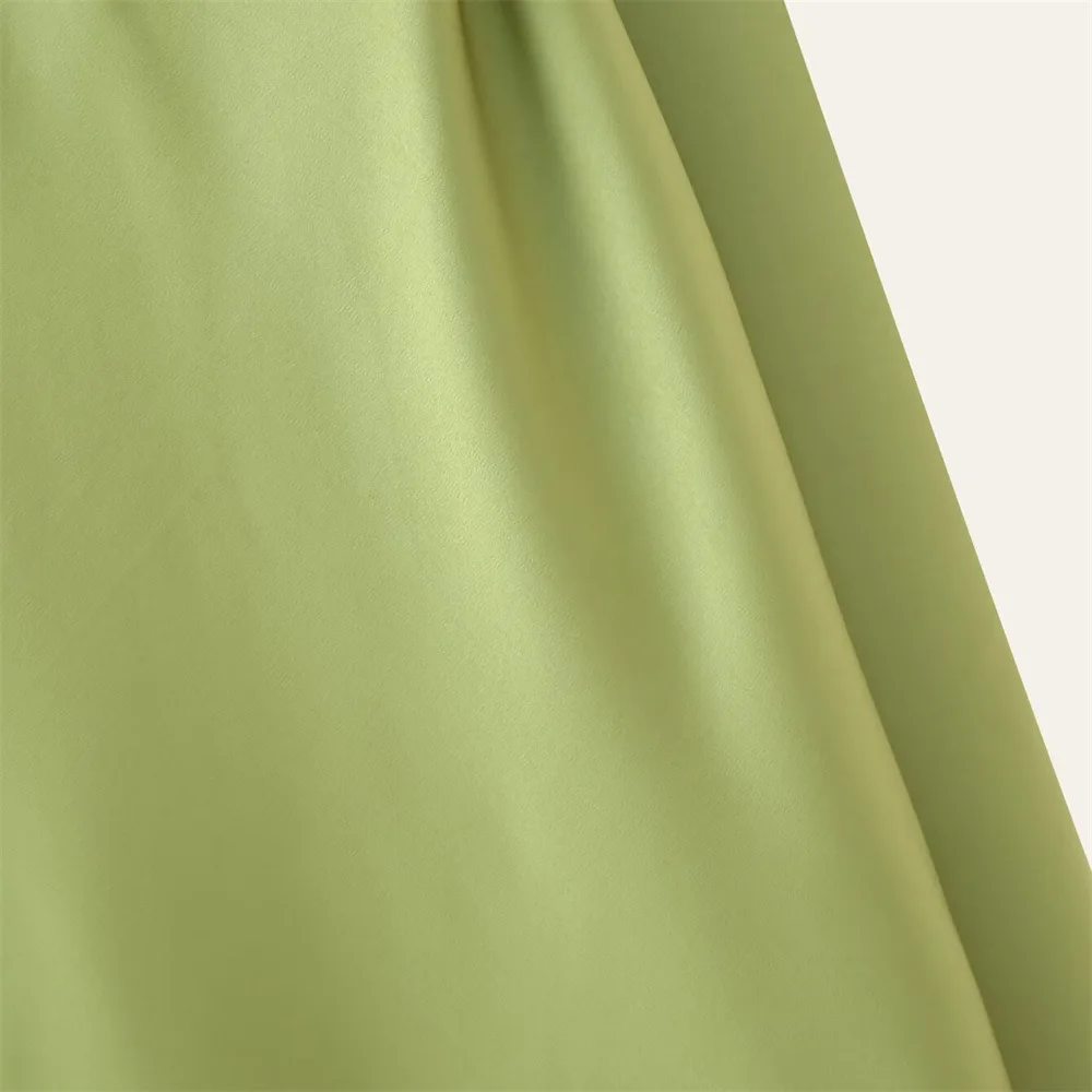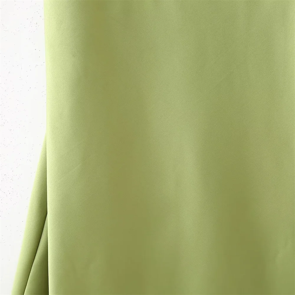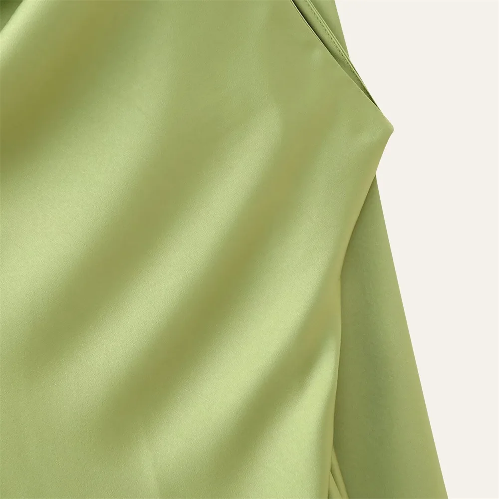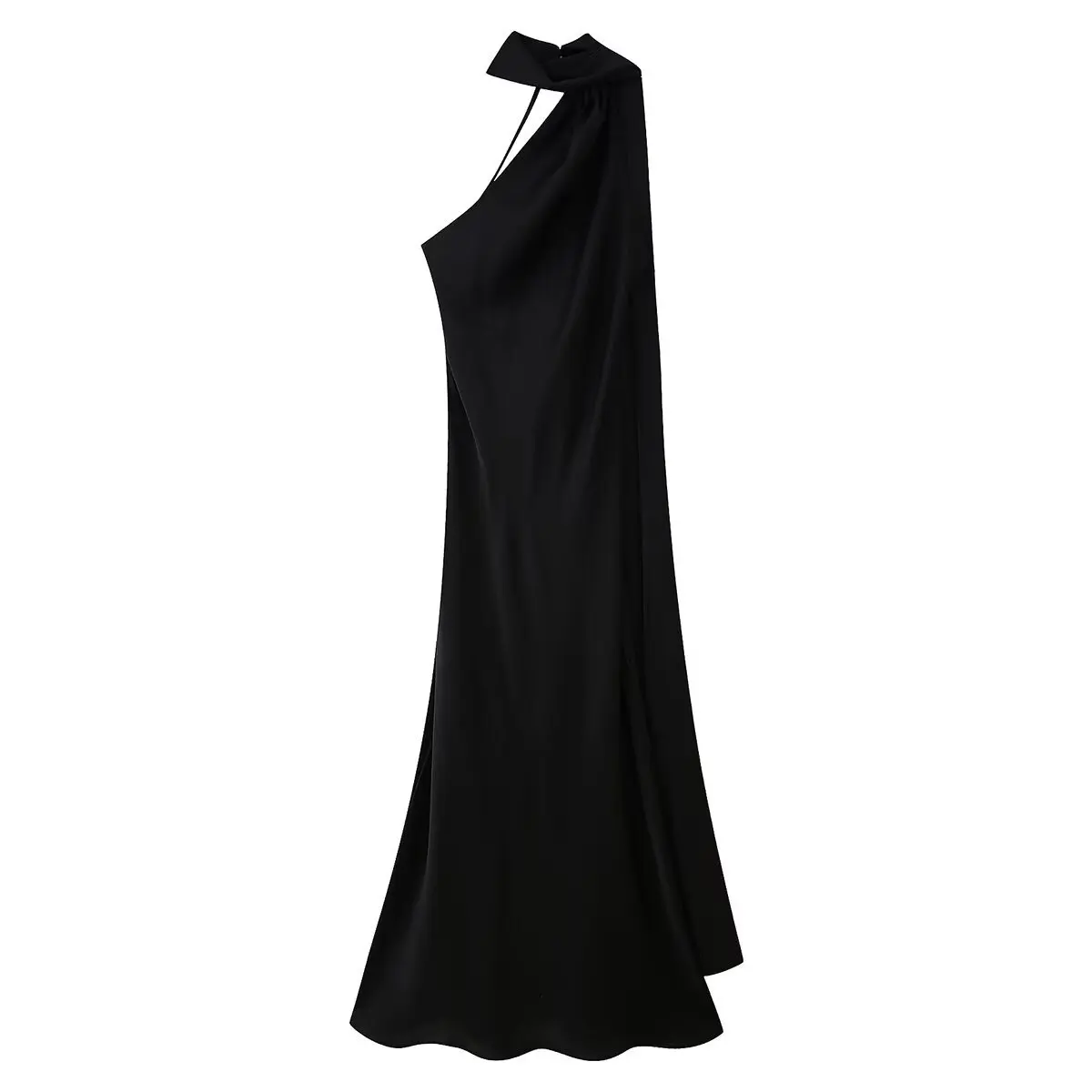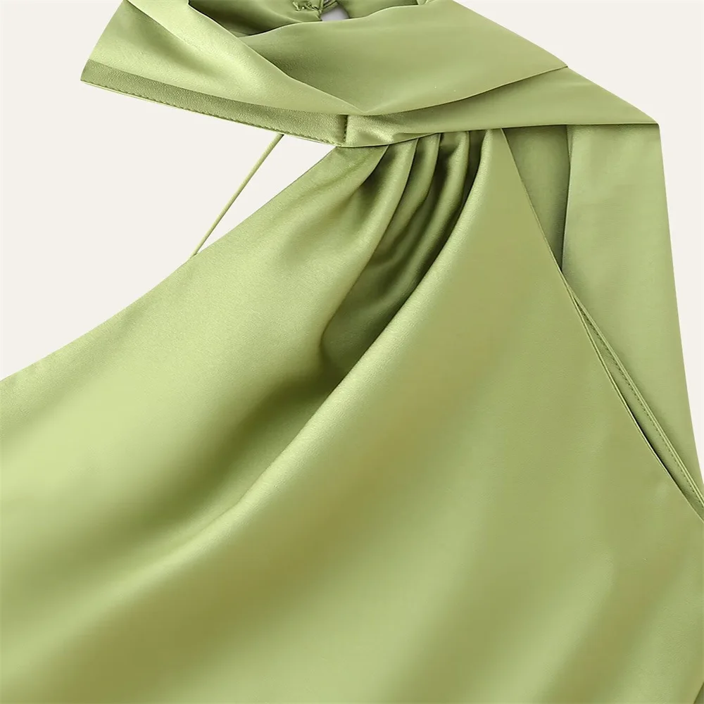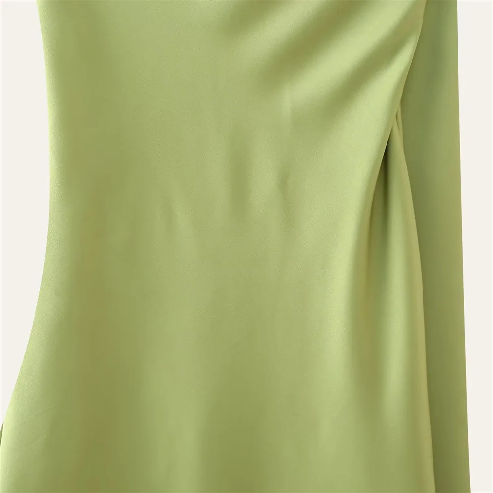 Com um design assimétrico de um ombro só, o vestido apresenta um caimento sereia suave que valoriza as curvas de forma elegante, sem exageros. O tecido acetinado cria um brilho luxuoso e discreto, proporcionando movimento sofisticado a cada passo. Para completar, a echarpe alongada integrada gera um efeito dramático e cinematográfico digno de editoriais de alta moda.